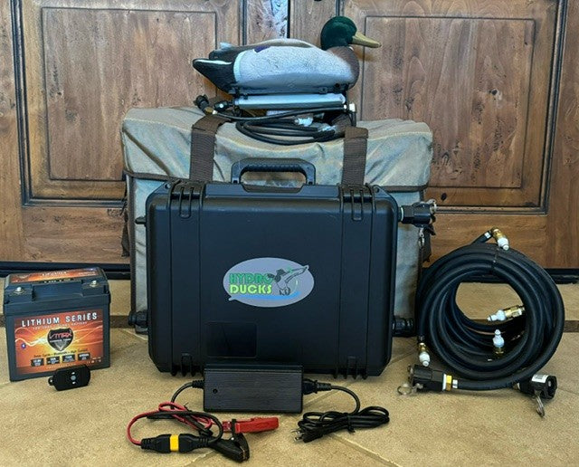 Our Portable Six-decoy System is favored by boat hunters who move between different locations daily, typically in waters ranging from 1 to 4 feet deep. It features a floating power unit housed in a Pelican case, equipped with a Shurflow diaphragm pump and a long-range waterproof remote, all powered by a 50-amp hour 12v lithium battery with charger.