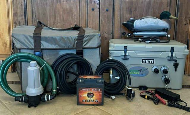 Our Semi-permanent Six Decoy Cooler System is ideal for hunters who frequent the same location and prefer leaving decoys out for the season. It features a Yeti cooler enhanced with mass load vinyl for quiet operation. Equipped with a Shurflow diaphragm pump, long-range waterproof remote, and a 50-amp hour lithium battery with charger, this system ensures reliable performance.